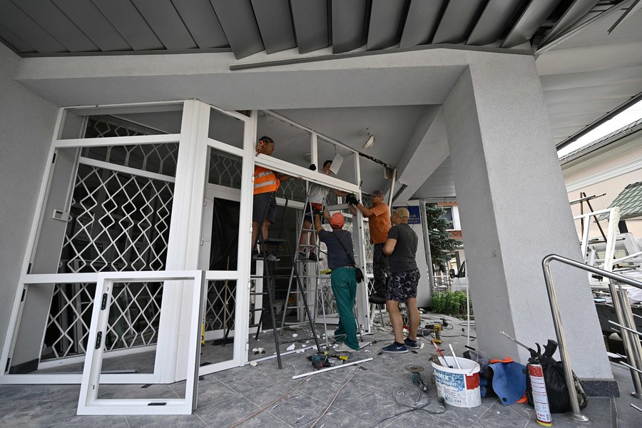 (Робітники ремонтують розбите скло та двері будівлі міського суду в місті Охтирка Сумської області, 1 серпня 2022. Будівля постраждала через бої за місто, які почались 24 лютого. Фото: Genya Savilov/AFP/Getty Images)