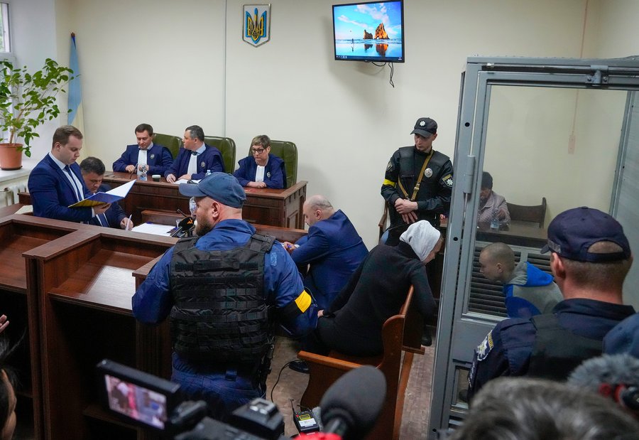 (Перший судовий процес щодо російських воєнних злочинів. 21-річного російського військовослужбовця Вадима Шишимаріна (праворуч за склом) засудили в українському суді на 15 років за вбивство цивільного на Сумщині. Фото: AP Photo/Efrem Lukatsky)
