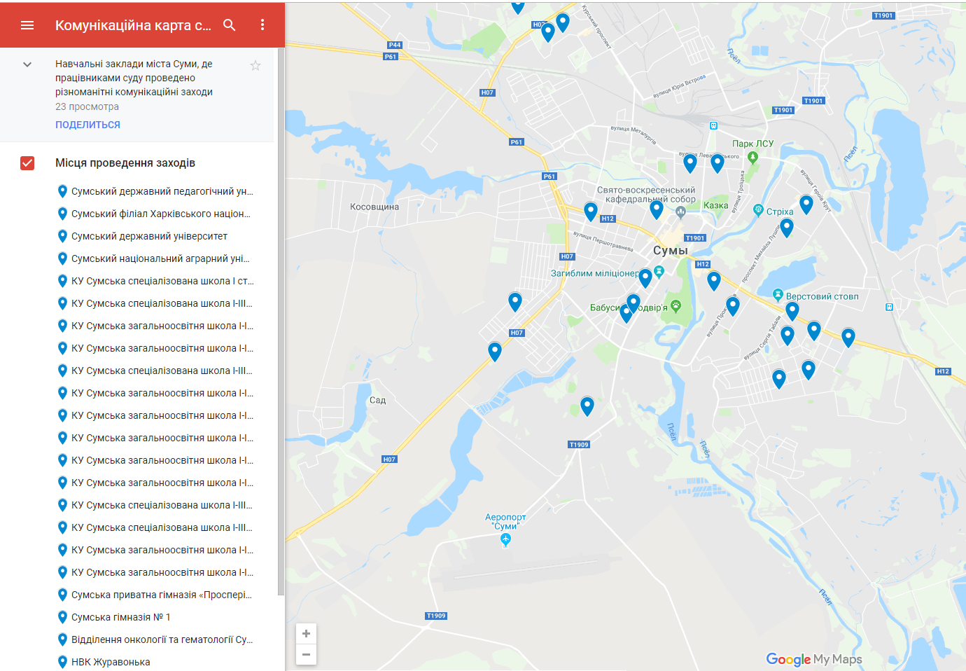 З лекціями та уроками справедливості працівники суду відвідали більшість навчальних закладів міста. Які саме? Тут Вам у нагоді стане інтерактивна карта, на якій зазначені усі школи та ВУЗи міста, вихованці яких стали нашими гостями, або працівники суду завітали до них. А клікнувши будь-який навчальний заклад – ви одразу побачите скільки комунікаційних заходів тут проведено. Карту можна переглянути за посилання: https://cutt.ly/LoTJfQ.