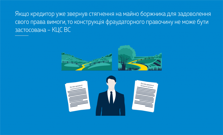 КЦС ВС неодноразово аналізував конструкцію фраудаторного правочину, тобто правочину, який вчиняється на шкоду кредитору для уникнення чи унеможливлення, зокрема, сплати боргу (коштів, збитків, шкоди) або виконання судового рішення про стягнення боргу (коштів, збитків, шкоди), що набрало законної сили, чи виконавчого напису.